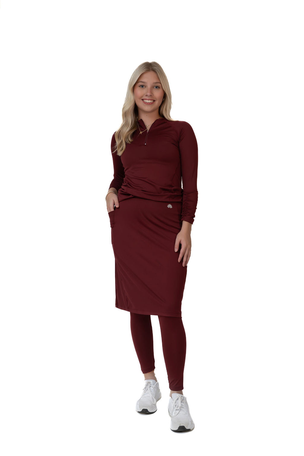 Our Fit Snoga is a knee length skirt that is a straight cut but still allows for movement, The ankle length attached leggings make for a modest and functional feature. A deep pocket on the skirt fits a phone or a few tennis or golf balls. This design is great for all sports and doubles as weekend hang-out gear! The fabric is chlorine safe so you are set for water activities that may await you. This is the perfect Travel Skirt!