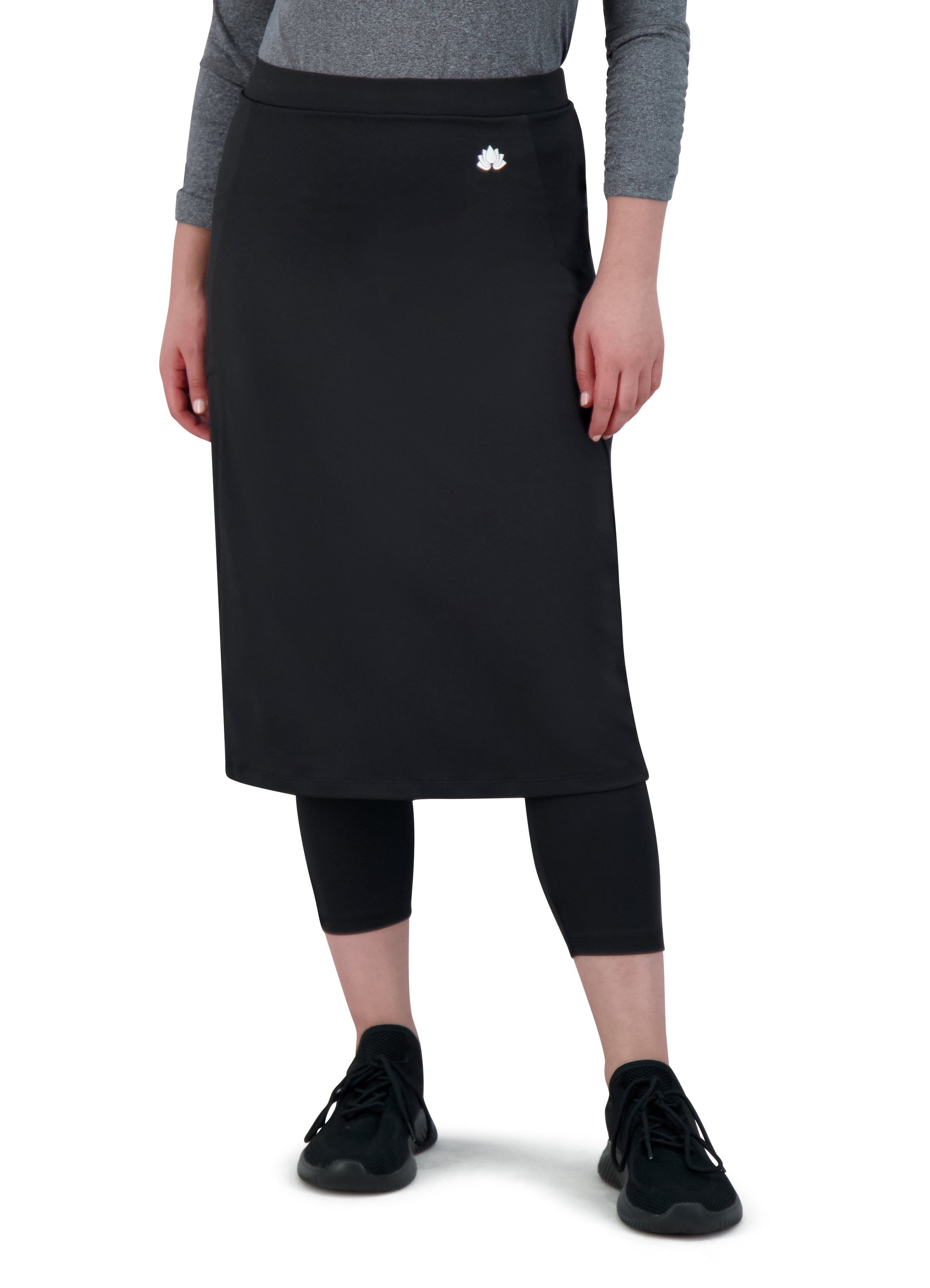 Our Fit Snoga 26" length skirt that is a pencil cut but still allows for movement, The ¾ attached leggings make for a modest and functional feature. A deep pocket on the skirt fits a phone or a few tennis or golf balls. This design is great for all sports and doubles as weekend hang-out gear! The fabric is chlorine safe so you are set for water activities that may await you. This is the perfect Travel Skirt!