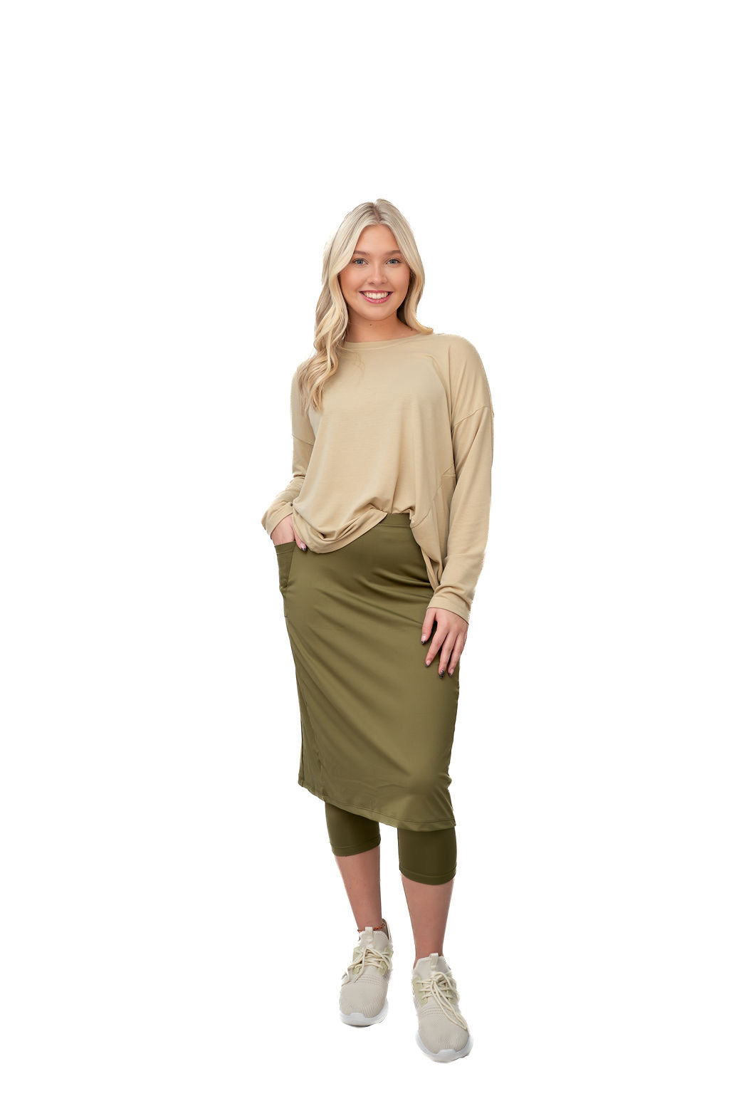 Our Fit Snoga 26" length skirt that is a pencil cut but still allows for movement, The ¾ attached leggings make for a modest and functional feature. A deep pocket on the skirt fits a phone or a few tennis or golf balls. This design is great for all sports and doubles as weekend hang-out gear! The fabric is chlorine safe so you are set for water activities that may await you. This is the perfect Travel Skirt!