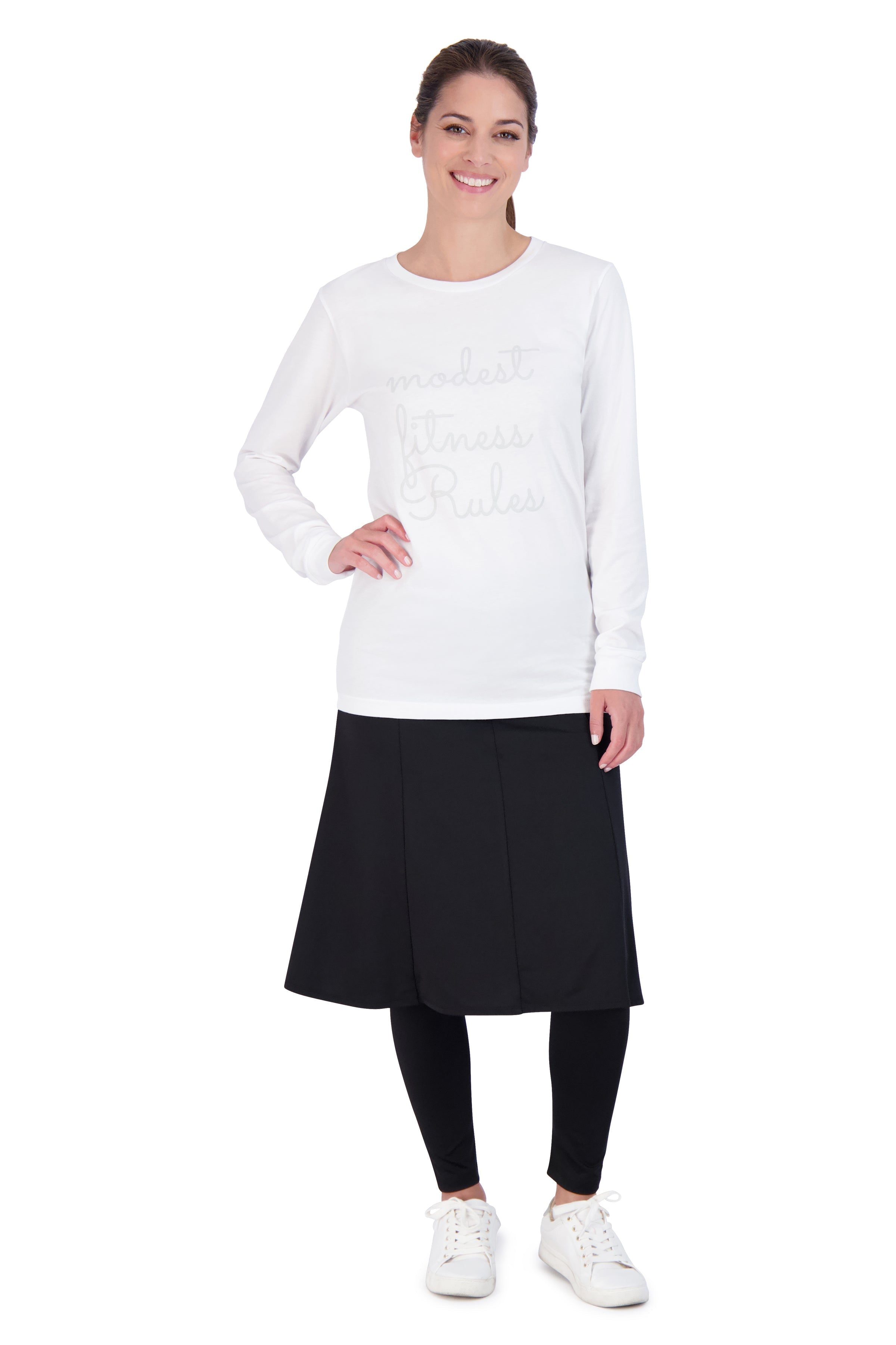 Our Ankle Ballet 24" Snoga is the perfect fit and flair. This below the knee style was designed for those gals that want a comfortable fit around their waist and a longer length skirt. Ankle length leggings will keep you warm in the cooler months. The fabric is light weight high performance activewear material that is quick drying and extremely long lasting. Its an adorable style with flats or sneakers when you are not exercising and perfect for traveling as it can be worn from day to evening. This style was previously known as the Dance Snoga (updated fit.)