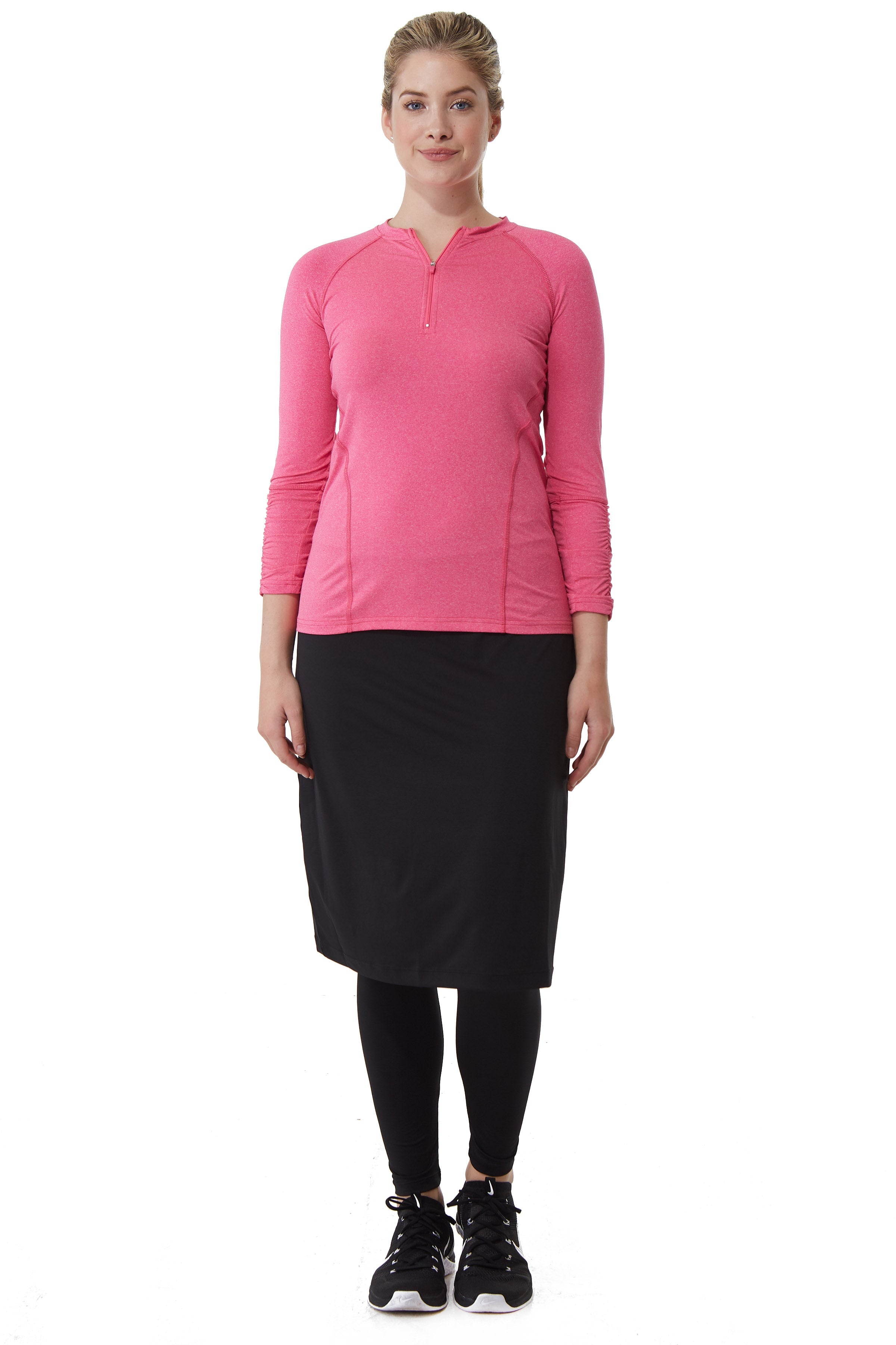 This midi-length Snoga was designed for those gals that are either tall or just want more coverage. This skirt is a soft pencil shape that is not hugging and has ankle length attached leggings to ensure that you are covered while either doing the sport of your choice, traveling, or just running around doing errands. The material is a high performance quick drying fabric that is chlorine safe so it is suitable for water sports. You can add a t-shirt or sweater and this style can take you anywhere.