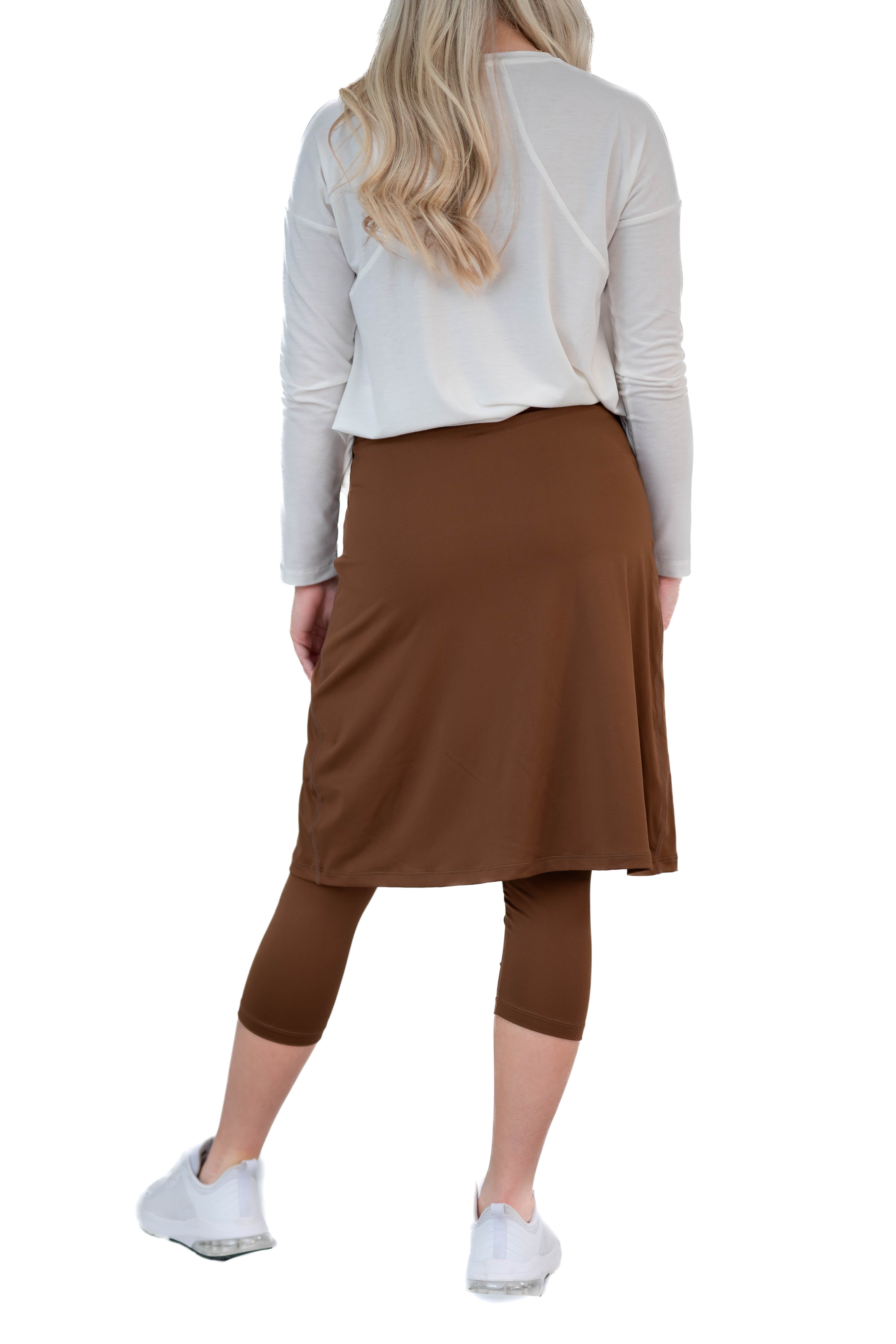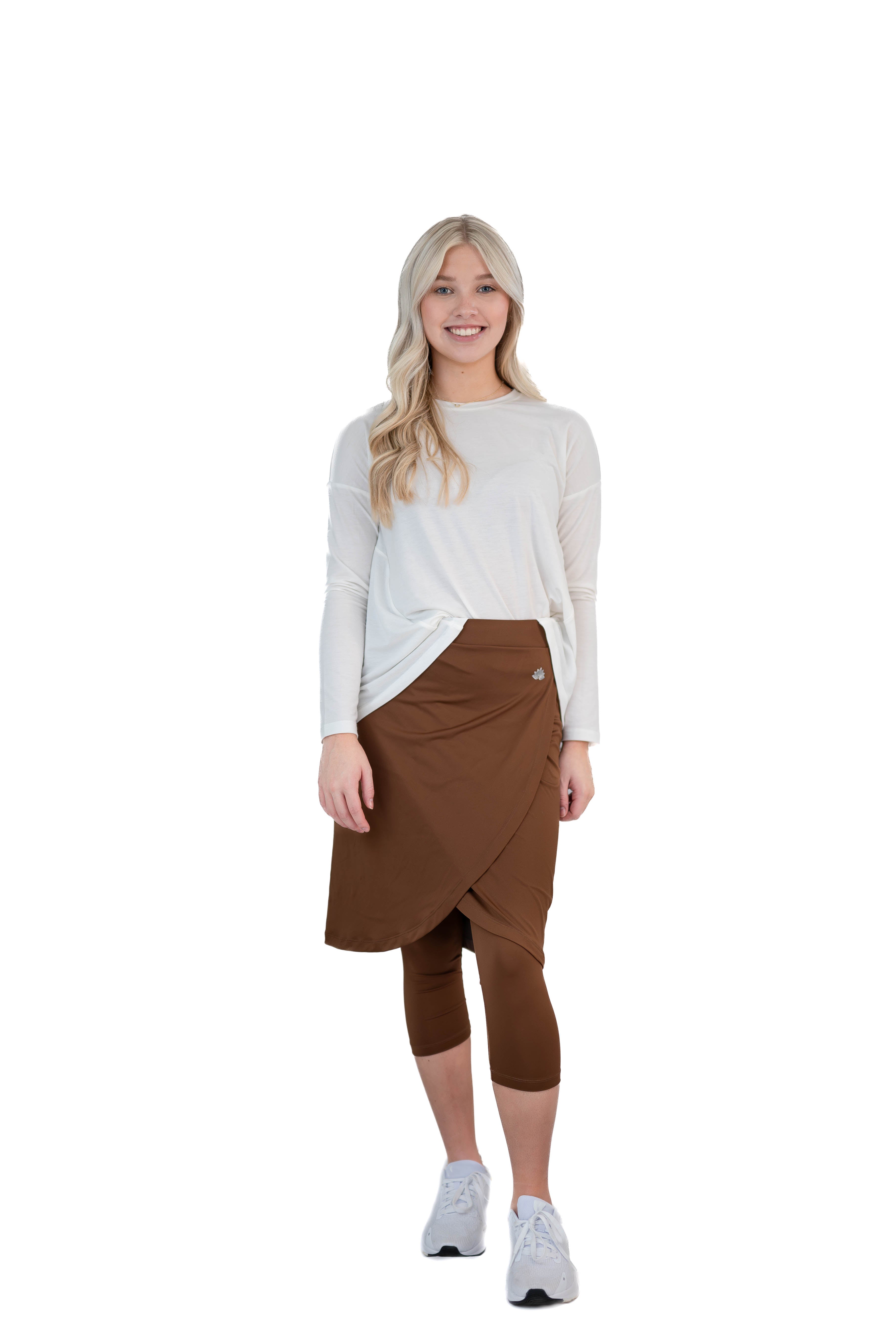This piece brings the look of a wrap skirt with the ease of Snoga—modern, modest, and made to move.