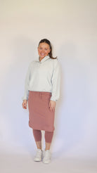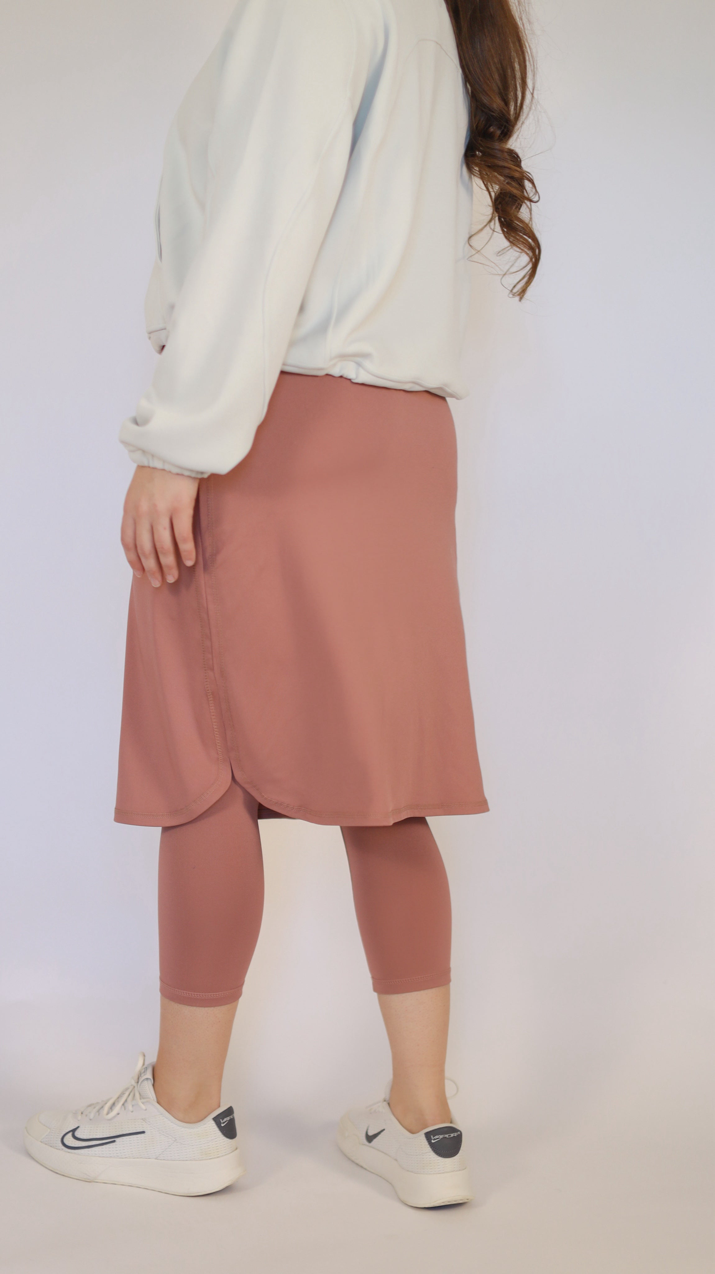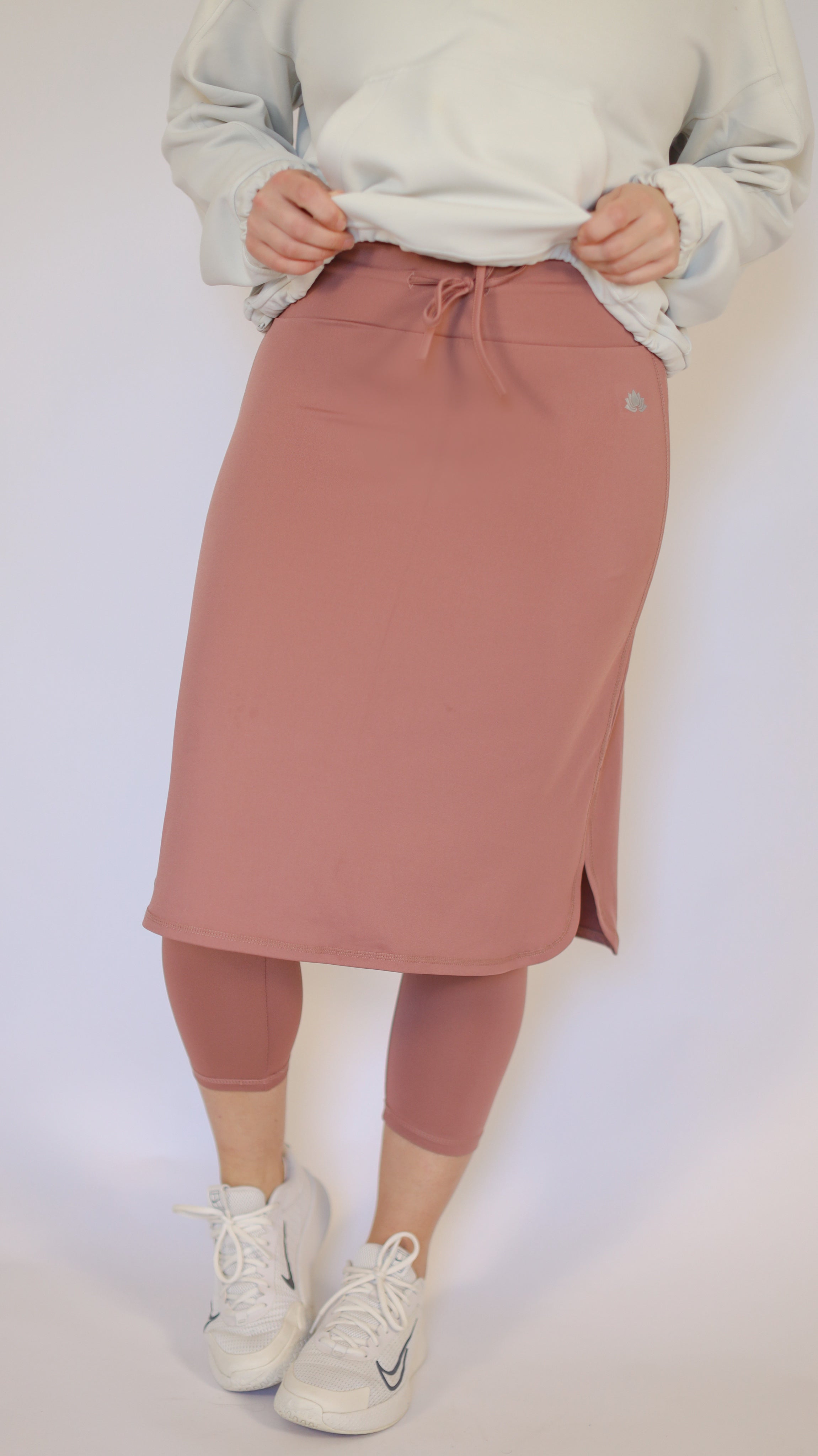 This high waisted drawstring style features a 3” wide waistband that provides a secure fitted feeling across the midsection. The skirt design has 3” side slits to enhance the relaxed pencil shape. This style offers adequate range of motion for most sports, and the attached capri length leggings add to the comfort of this style.