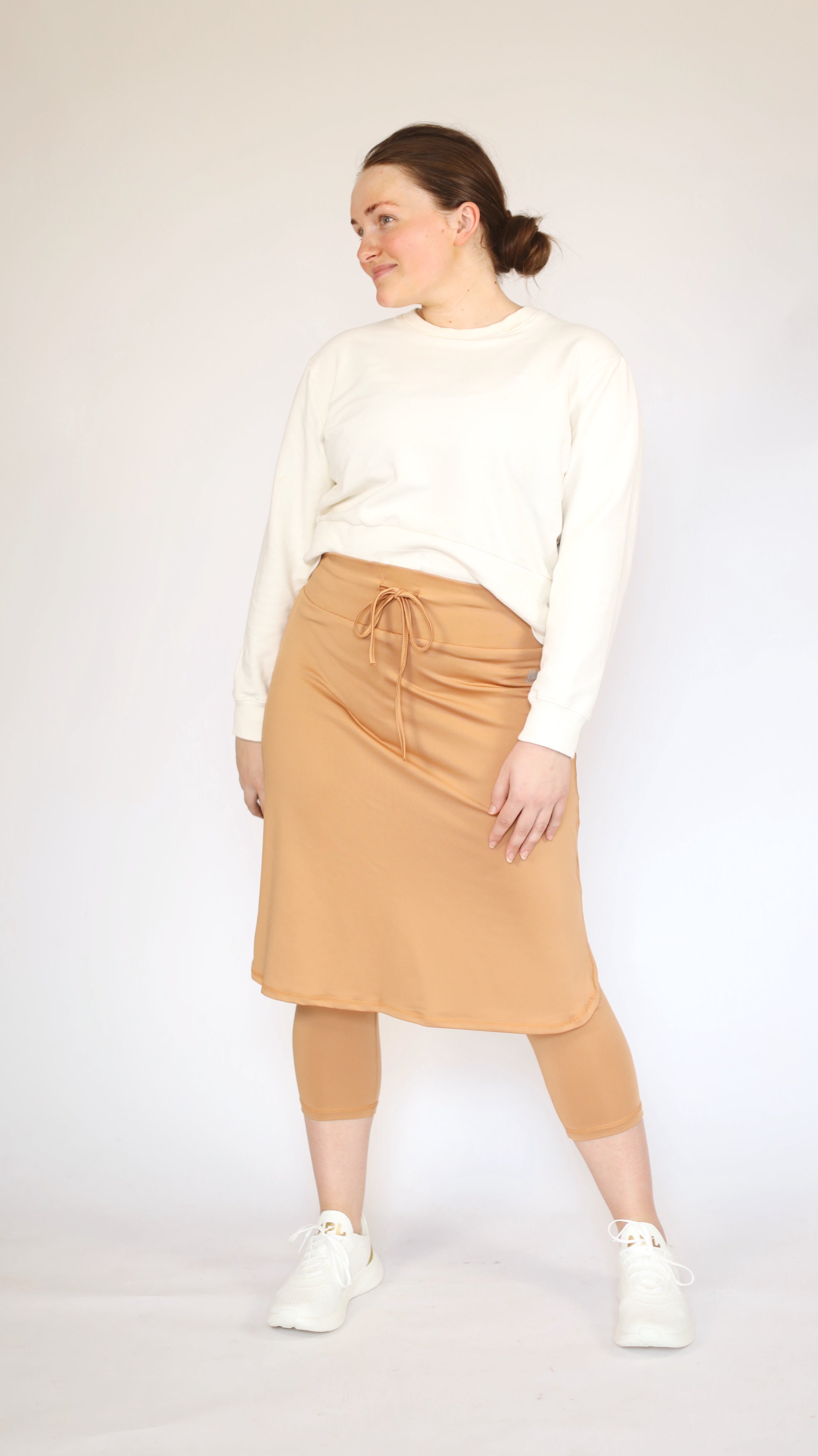 This high waisted drawstring style features a 3” wide waistband that provides a secure fitted feeling across the midsection. The skirt design has 3” side slits to enhance the relaxed pencil shape. This style offers adequate range of motion for most sports, and the attached capri length leggings add to the comfort of this style.