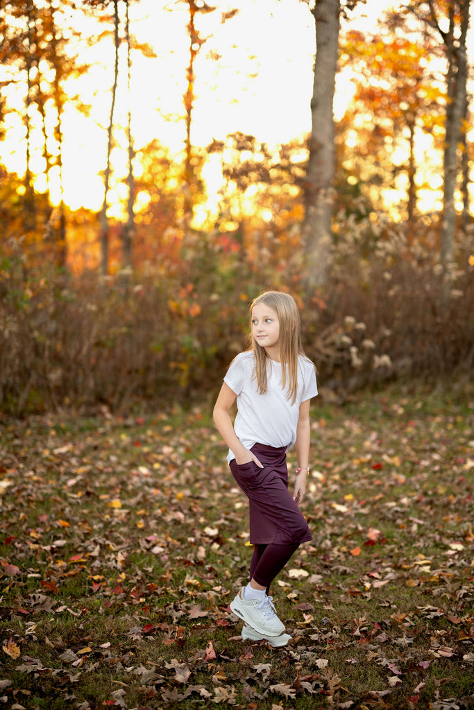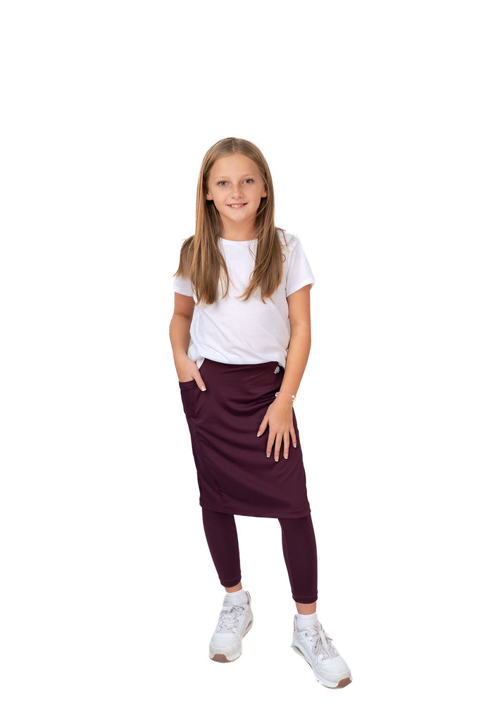 The SNOGA girl's straight skirt with pocket and attached ankle length leggings features our famous quick dry fabric for terrific style and a comfortable, chafe-free fit. These girl's modest skirts were designed with a stretch that bounces right back after washing. They are both water and chlorine safe and dry fast after washing. With a comfortable hidden elastic waistband, this stylish yet modest look is great for school, PE, gym class, biking, dancing, yoga and more.