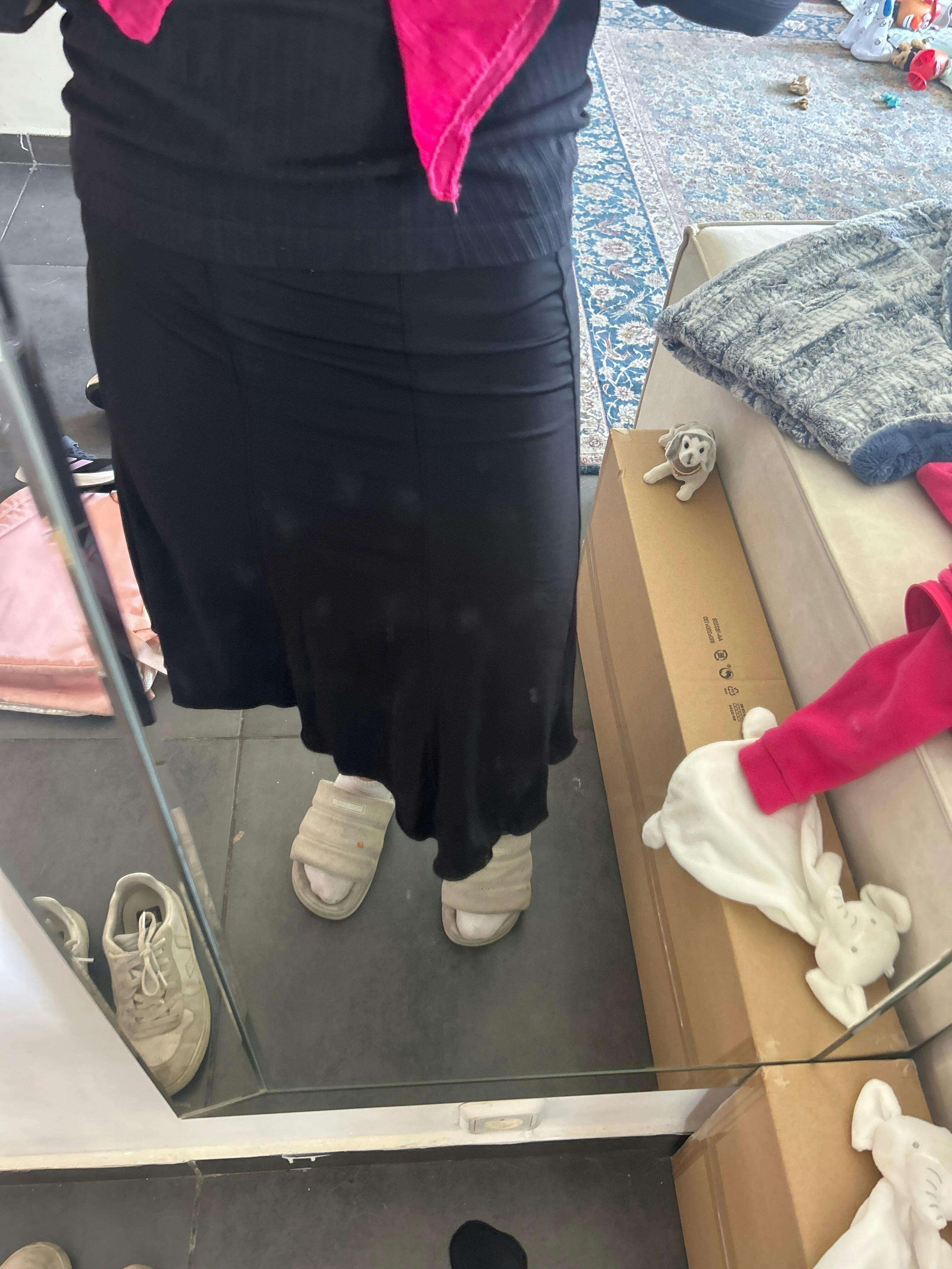 This wonderful basic pull on skirt is designed as a fit and flare. The material lays flat on the stomach and then softly flares in order that it is flattering. The material is a light weight poly-jersey that can be worn in the day with a t-shirt as well as by night with a blouse or sweater. It's the perfect skirt to pack for a get-away as it is truly multi-purpose. It makes a wonderful bathing suit cover up as well. There are no attached leggings, but many ladies tell us they throw this on over their own leggings.